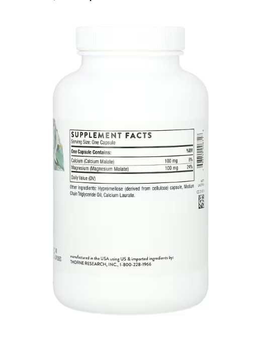 How much magnesium and calcium do you need? The appropriate intake ratio of calcium to magnesium varies, with some scientific literature supporting a 2:1 ratio (twice as much calcium as magnesium), with other experts recommending a 1:1 ratio. Thorne’s Calcium-Magnesium Malate provides a 1:1 ratio.